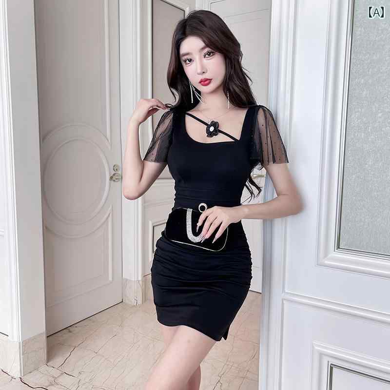 キャバ 魅惑 ドレス レディース 黒 パブ 長袖 レース タイト スカート エレガント プリーツ 韓国 セクシー