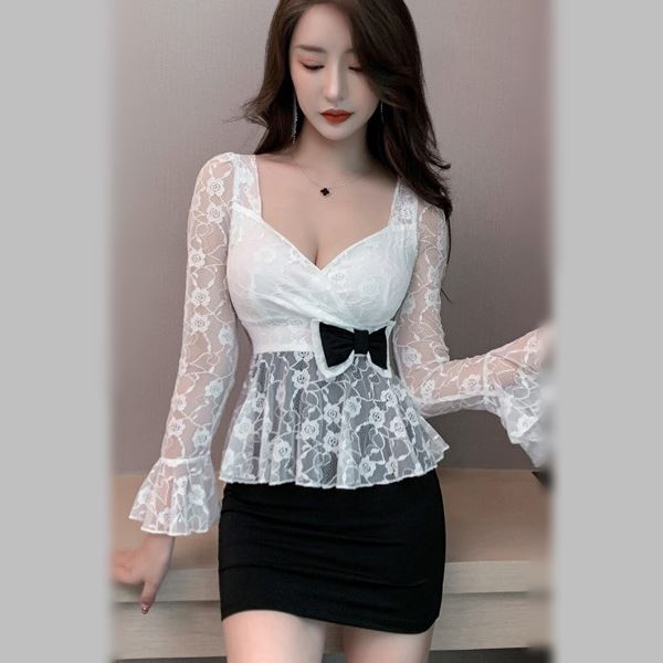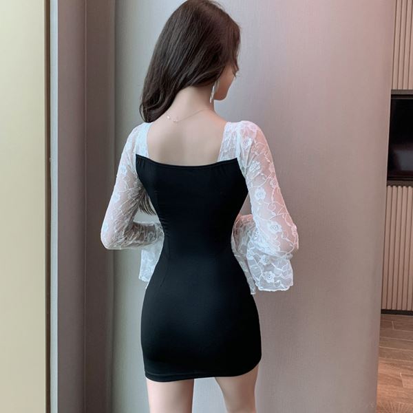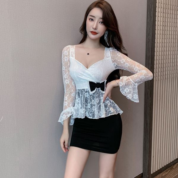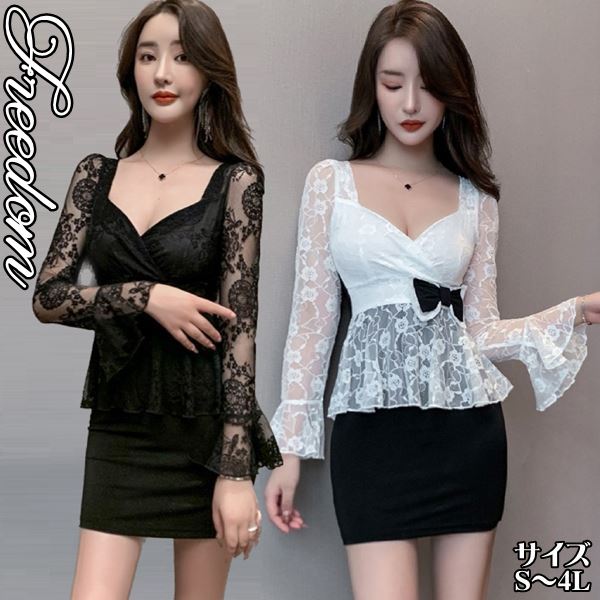★人気のセクシーミニ!可愛いリボン使いレース切り替えウエストペプラムセクシーミニ丈ドレスです♪