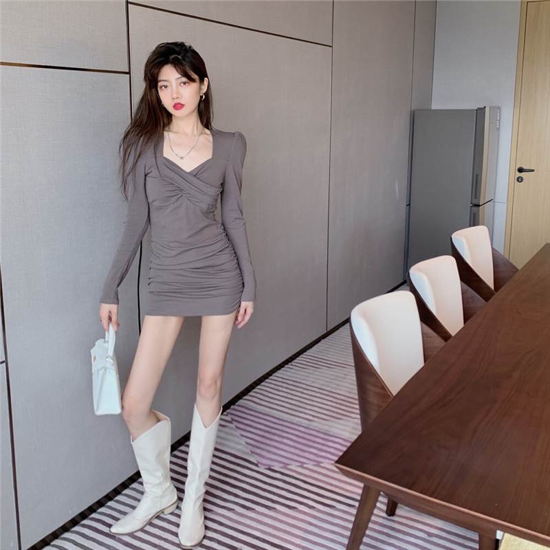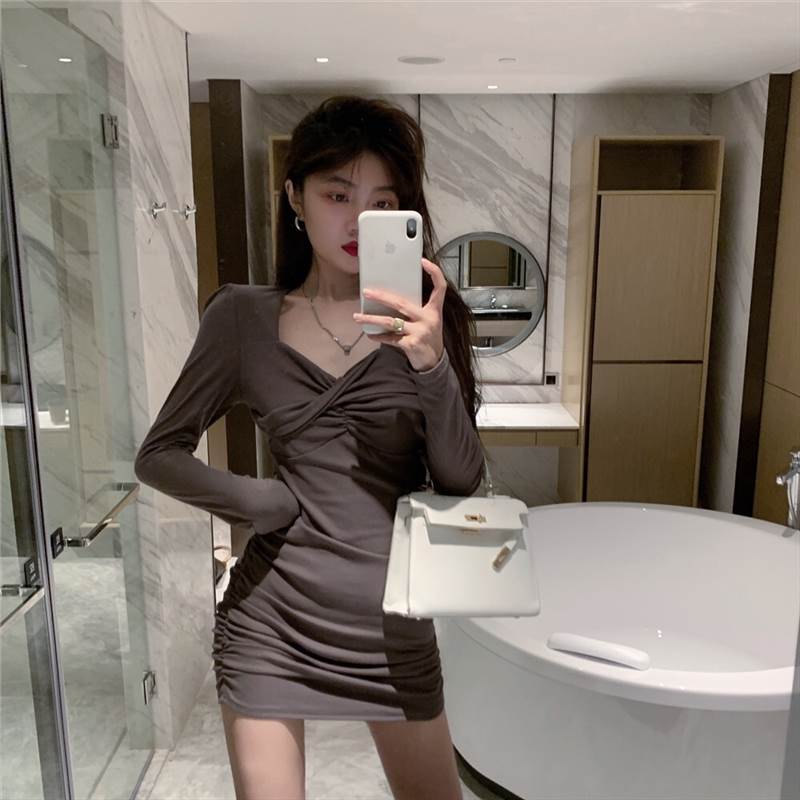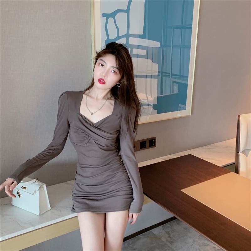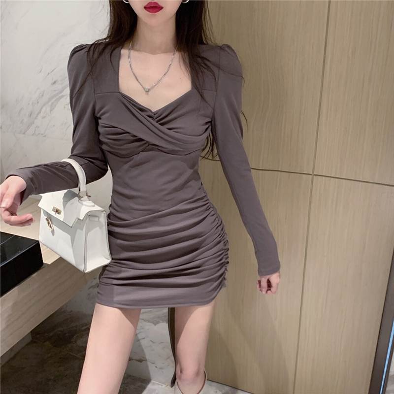 2色 ワンピース ミニ ドレス キャバドレス タイト 大人可愛い セクシー レディース 長袖 露出 肌見せ グレー 灰色 ブラック 黒 大人カラー パーティードレス 超ミニ 袖あり キャバ ギャ 無地