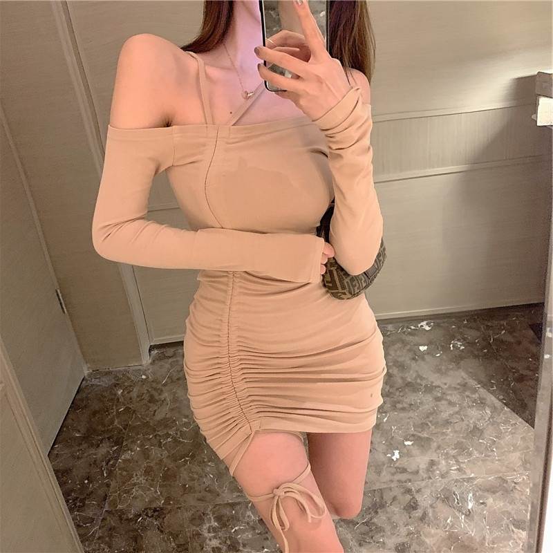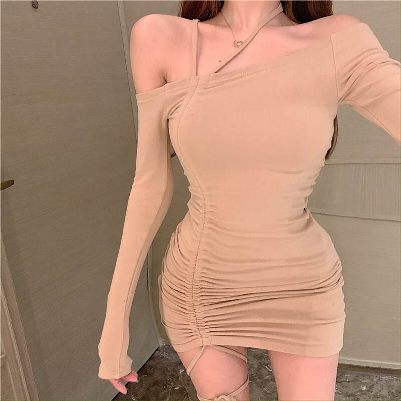 2色 ワンピース ドレス ミニ タイト キャバドレス セクシー アシンメトリー レディース ワンショルダー オフショルダー 個性的 肩出し リボン ブラック 黒 茶色 カーキ タイ ブラウン