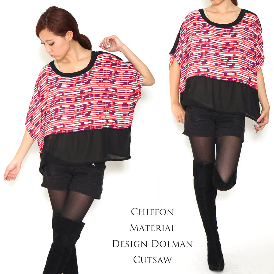 シフォン チュニック トップス ドルマン 半袖 シャツ レディース ブラウス 春 夏 春ワンピ 切り替え 大人かわいい 可愛い レトロ ナチュラル ポンチョ風 幾何学模様 ドルマ エレガント