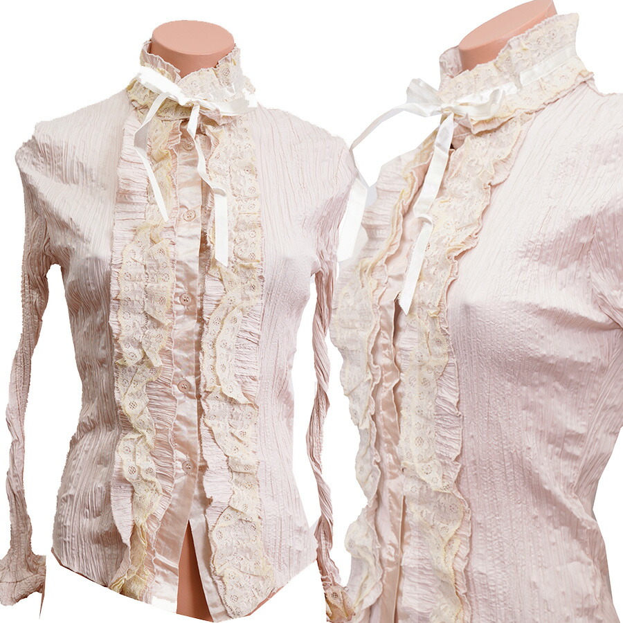 限定1着 英国調 ヴィクトリアン フリルレース ワッシャーシャツ シワシャツ ブラウスクリンクルベージュ 9号M通勤通学しわシャツゴスロリL ¥3980以上 プリーツシワ加工