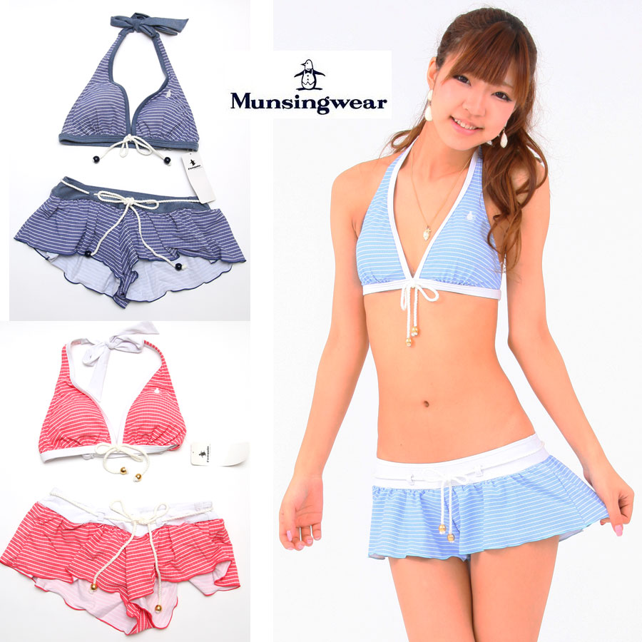 Manisingwear 東レ レディース限定1着 マリンボーダー大人エレガント マルチボーダー柄 セクシー ホルターネック ビキニ カバーパンツ 水着 青 赤 紺¥3980以上 9号M