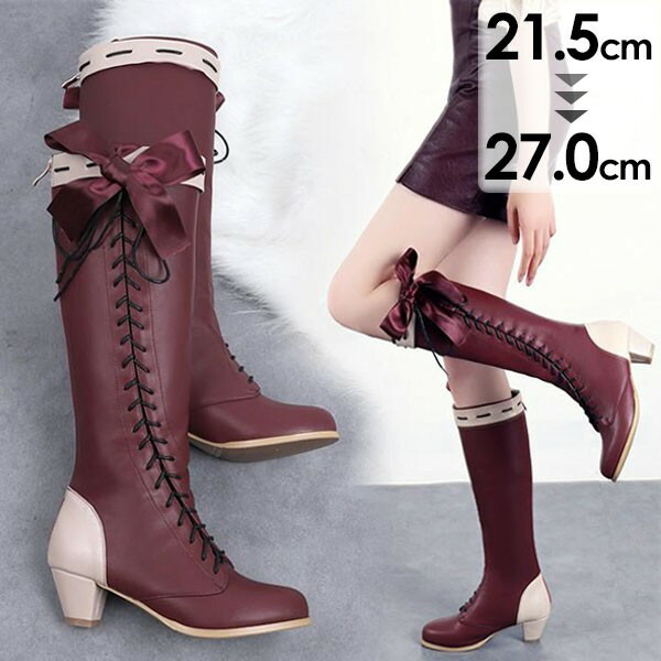 ロングブーツ ローヒール 4cm ロリータ リボン ゴシック 編み上げ レースアップ 歩きやすい チャンキーヒール バイカラー 太ヒール 美脚 カジュアル レディース 春 冬 可愛い 小さいサイズ 秋