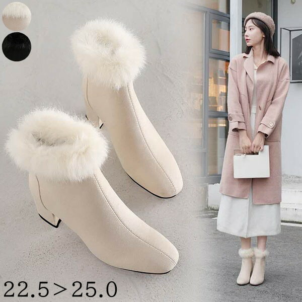 レディース ショートブーツ フェイクファー スエード あったか ヒール5cm 可愛い ふわふわ もこもこ lolita ロリータ リボン 防寒 通勤 滑りにくい ブラック オフホワイト 22.5 雪靴